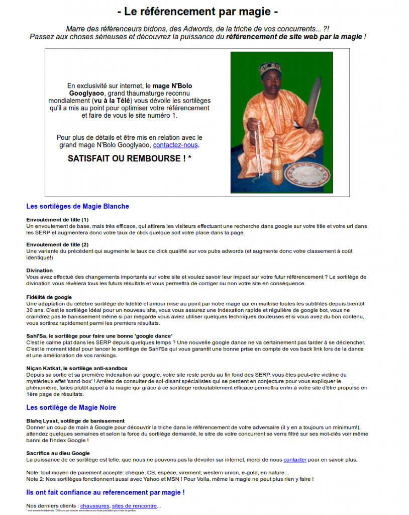 Je crois que c’est de ce genre de sorcier dont on vous parle dans cet avertissement. Alors sacrifice ou pas sacrifice? Mais bon, moi j’ai ma part de sorcier du référencement hein… ?